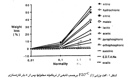 جدول ۲ : افت وزنی (Z) پس از ۲۰ بار تازهسازی محلول های 0.1 نرمال اسیدهای مختلف