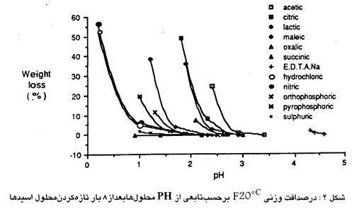 شکل ۲ به وضوح نشان می دهد که محدوده های قابل قبول تنها برای یک اسید مورد نظر مهم است زیرا قدرت اسیدها متفاوت است. مخصوصاً جالب است ملاحظه شود که محدوده های PH برای اسیدهای قوی نظیر هیدروکلریک یا نیتریک کمتر از اسیدهای ضعیف نظیر لاکتیک یا استیک است. این را به سادگی می توان توضیح داد: برای یک غلظت مشخص محلول های اسیدهای ضعیف PH بالاتری نسبت به محلولهای اسیدهای قوی دارند. مثلاً اسید استیک 0.1N،PH 2.9 دارد در حالیکه PH اسید هیدروکلریک 0.1N یک است. لذا برای یک PH مشخصی اسیدهای قوی غلظت کمتری نسبت به اسیدهای ضعیف دارند و به همین علت می توانند کمتر خورنده باشند.