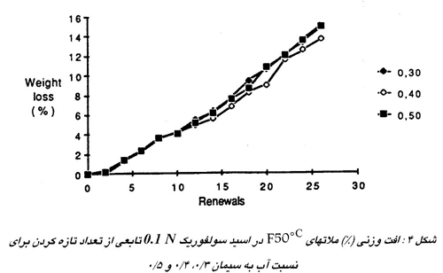 اهمیت تخلخل بستگی به قابلیت حل شدن نمکهائی که تشکیل می شوند دارد. این پارامتر وقتی خیلی مهم است که میزان حل شدن نمکها زیاد باشد: شکل ۳ افت وزنی ملاتهای فوندو که به مدت شش روز در °C 50 هیدراته شده اند و در محلول اسید لاکتیک 0.1 N فرو برده شده اند را نشان می دهد. با بالا رفتن نسبت آب به سیمان و در نتیجه افزایش تخلخل نرخ خوردگی به میزان قابل ملاحظهای افزایش می یابد.