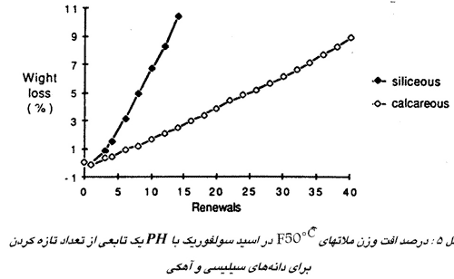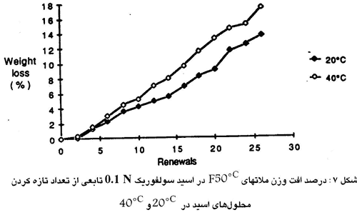 اثر دما روی ملاتهای فوندو =0.4 W/C که در محلولهای 0.1 N اسیدهای استیک لاکتیک و سولفوریک فرو برده شدند اندازه گیری شده است. همانطور که در شکل ۹ نشان داده شده است افزایش دما از “20 به 40 نرخ خوردگی اسیدهای استیک و لاکتیک را بطور قابل ملاحظه ای تغییر نمی دهد. برعکس خوردگی اسید سولفوریک حدود ۲۵ درصد افزایش می یابد. (شکل ۷) این پدیده را اینطور می توان توضیح داد که قابلیت حل شدن کلسیم سولفات با افزایش دما افزایش می یابد ،در حالی که قابلیت حل شدن کلسیم استات و ملسیم لاکتات آنقدر زیاد هست که تغییر آنها با دما اثری قابل اغماض دارد.
